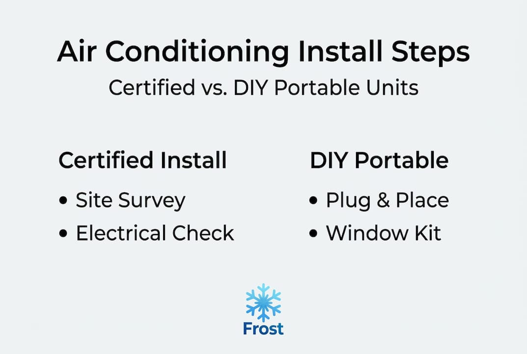 Portable units are permitted for DIY use, but they are less efficient and noisier than professionally installed split systems and struggle to cool larger rooms effectively.